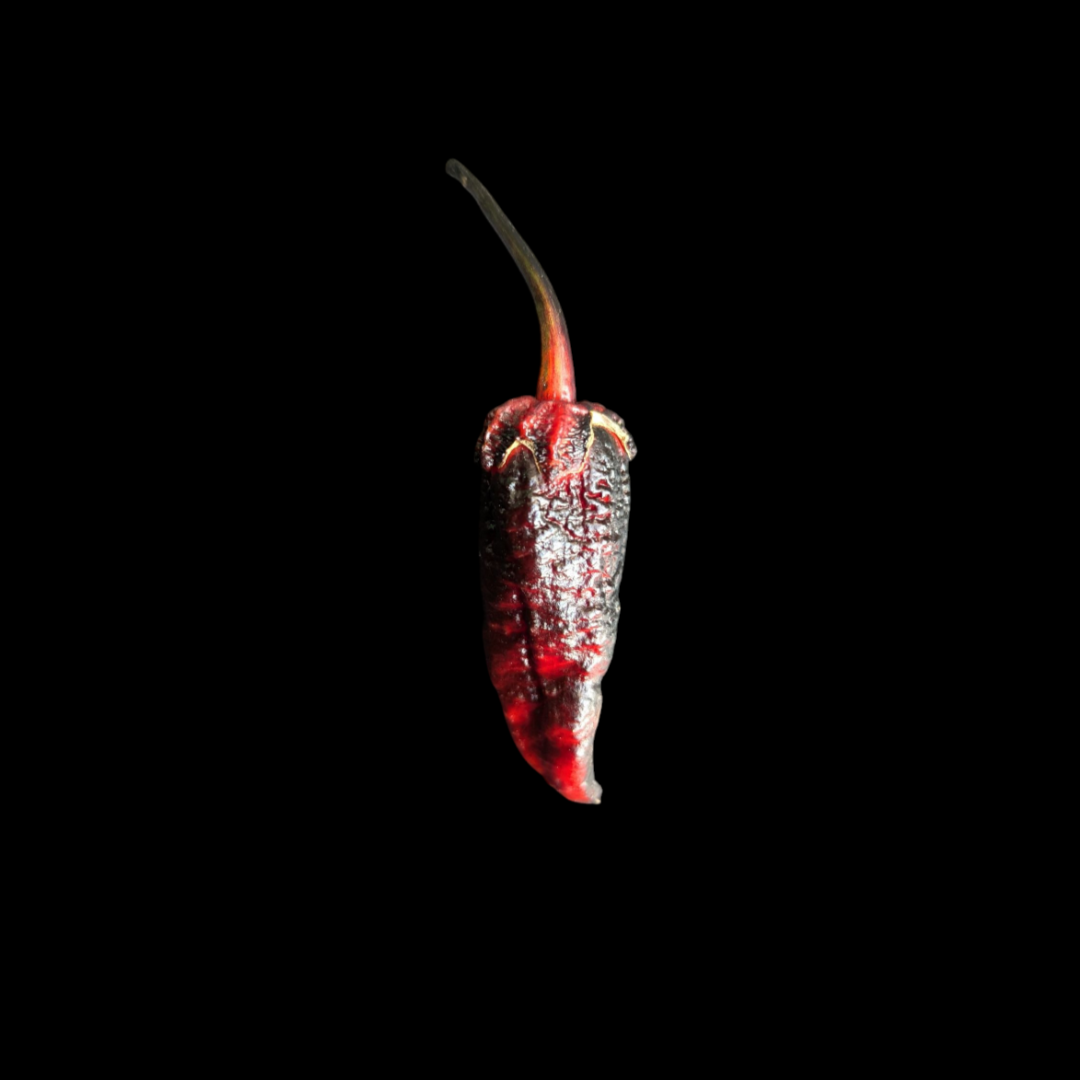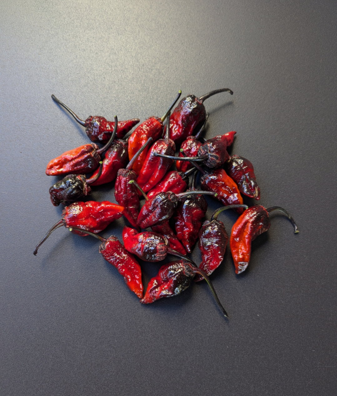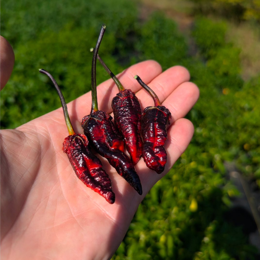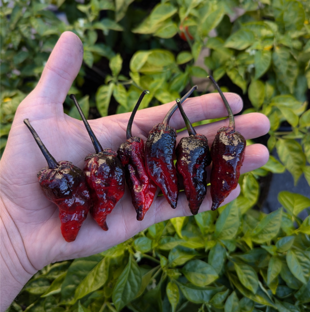 This is the most anticipated pepper we grew in our garden. A dark foliage plant with red bleeding through the calyx and ripening under the black skin of the pepper. This is an absolute scorcher of a pepper in not only appearance but in taste it will leave you crying and wanting more.