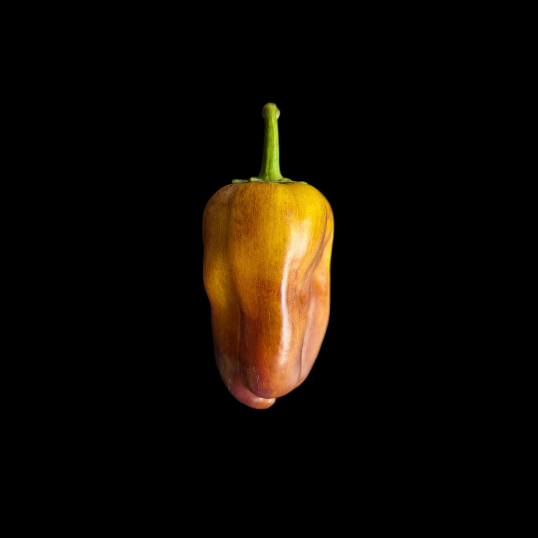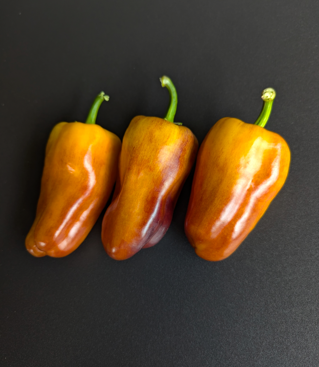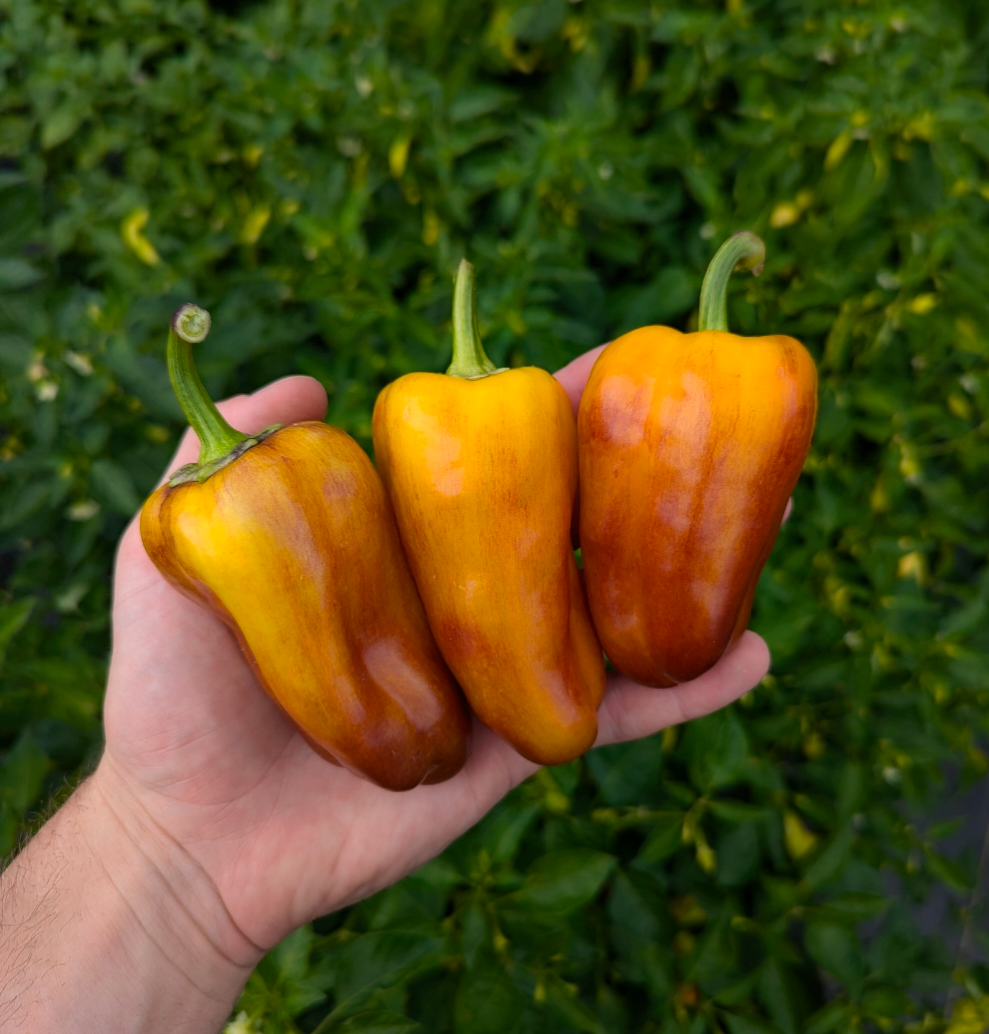 These are some unique and rare sweet peppers we grew this year. This heirloom variety comes from Eastern Europe. Each pepper will grow in this elongated shape, beginning with a violet colour before ripening with a blend of yellow through its flesh. Peppers are super sweet, juicy, crunchy and delicious.