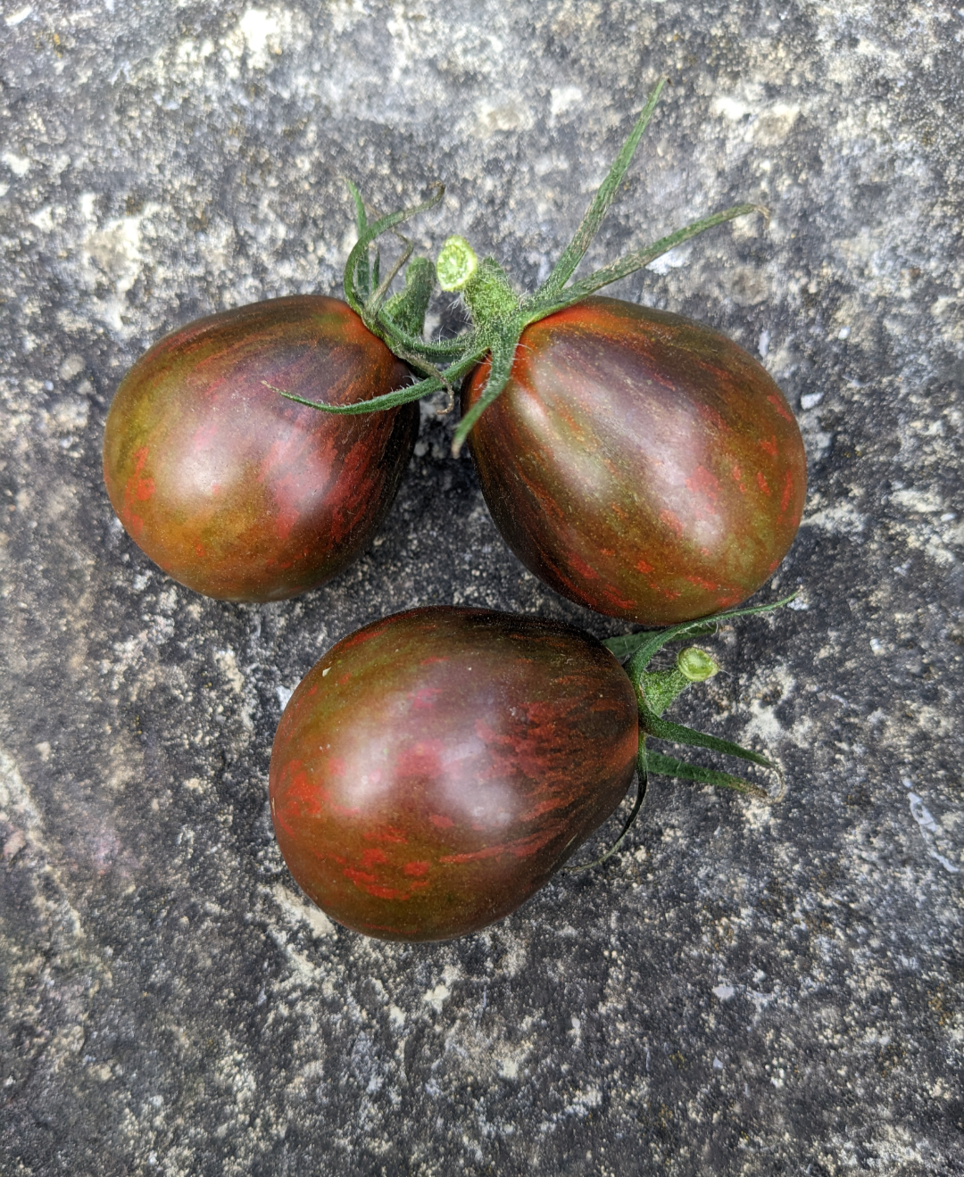 The most interesting cherry tomato we have grown. Colour patterns consisting of red, black and green stripes surely to catch everyone's attention. Slightly larger than our other pear / cherry tomatoes and is a very heavy producer. Tomatoes are on the firmer side and are a little challenging to determine when they are completely ripe, but look for the red undertones to come through. Enjoy the the complex earthy flavours of these tomatoes next season.