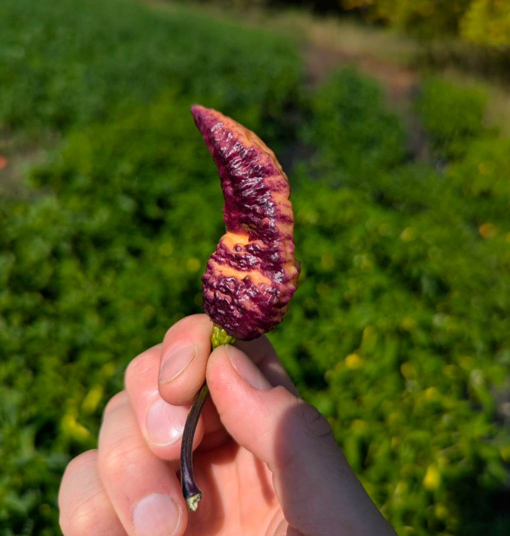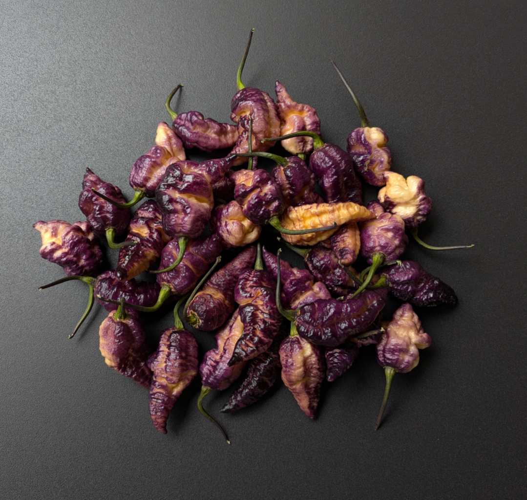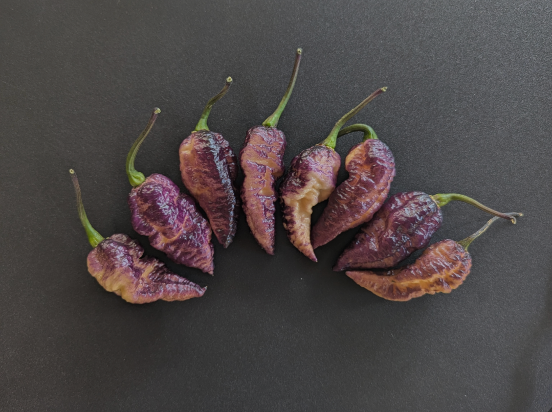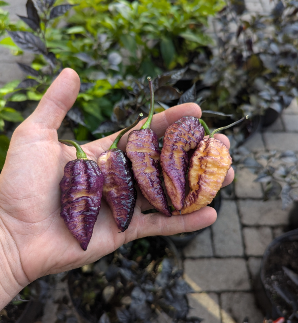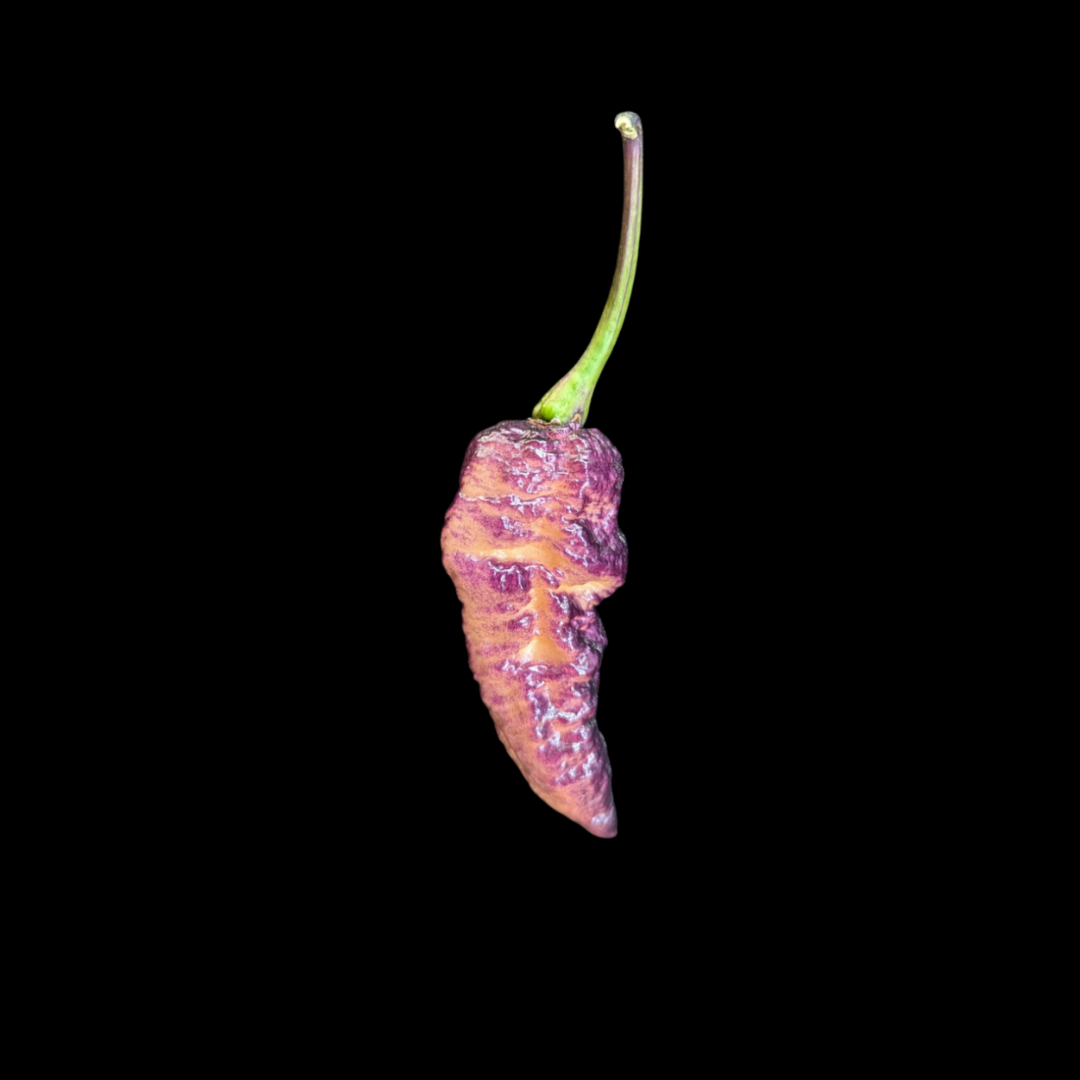 This unique and one of a kind pepper is a must grow to impress all your pepper friends. The BBG Hellwalker Peach is a cross between Pockmark Peach and BBG7 Dream. Grown on a dark foliage plant pods start off dark purple and ripen peach under the gnarly bumps on the skin.
