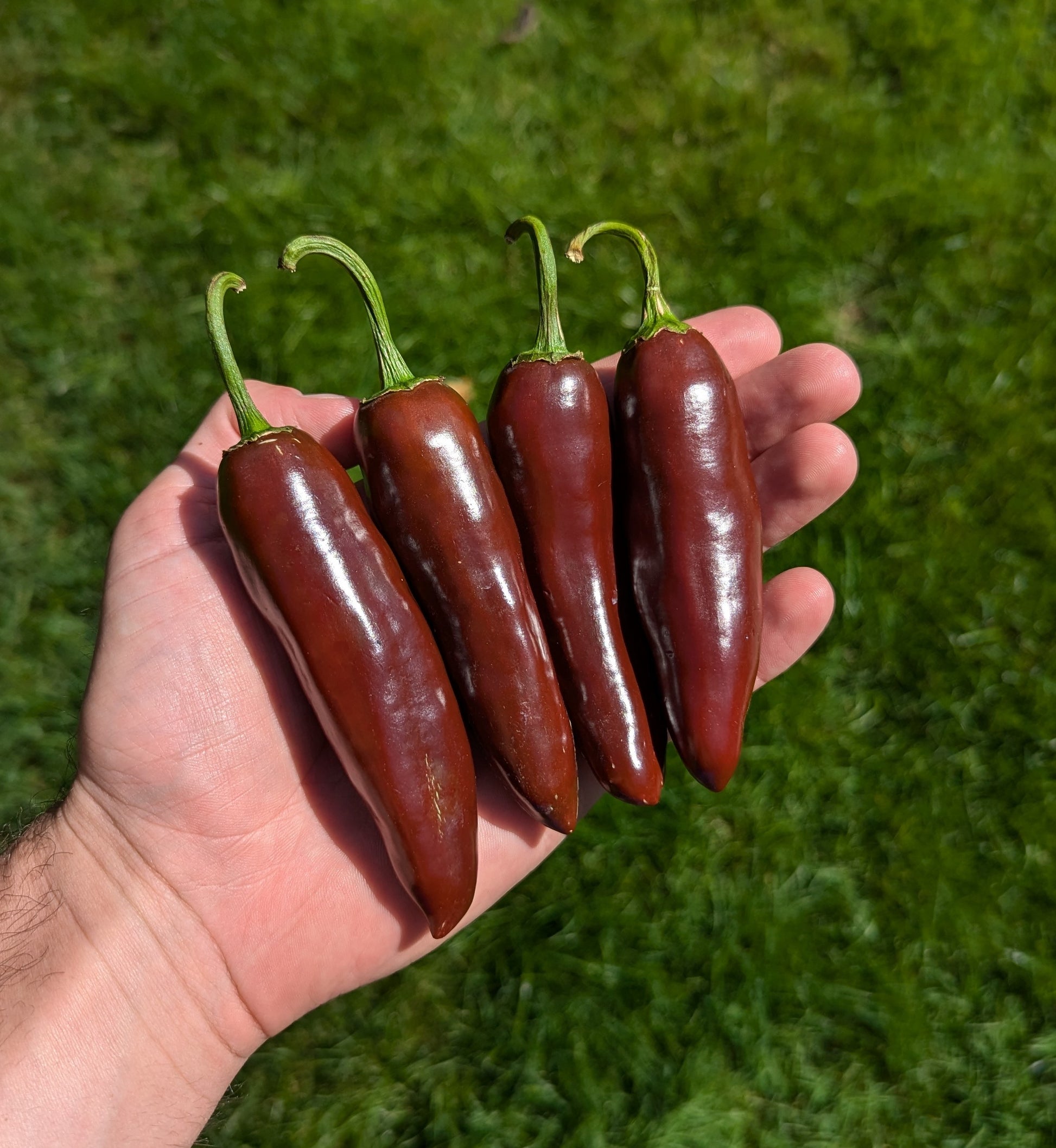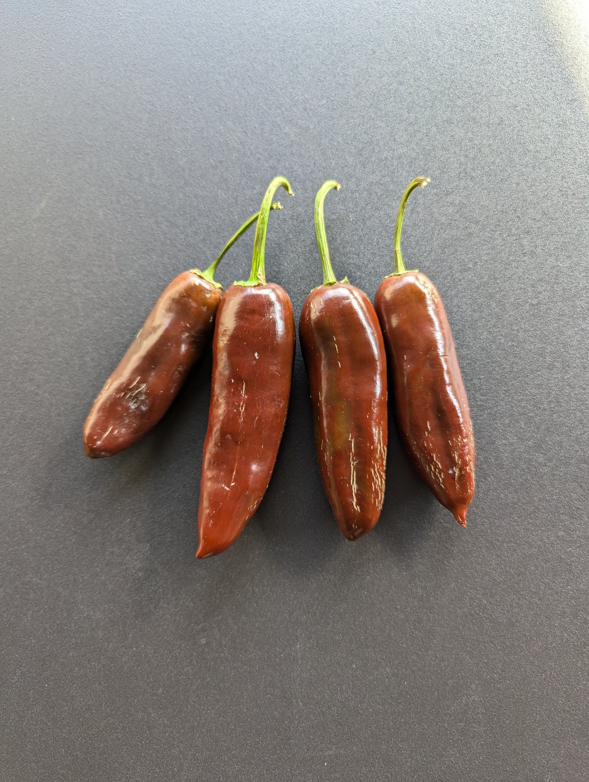 Check out these beautiful peppers. a chocolate version of the Jalapeño. This variety is surprising popular for its flavour. These plants were producing the most peppers compared to our other Jalapeño varieties. Each of them fell over due to the shear weight of peppers they were carrying. Pepper pods are of the larger sized compared to other Jalapeños.