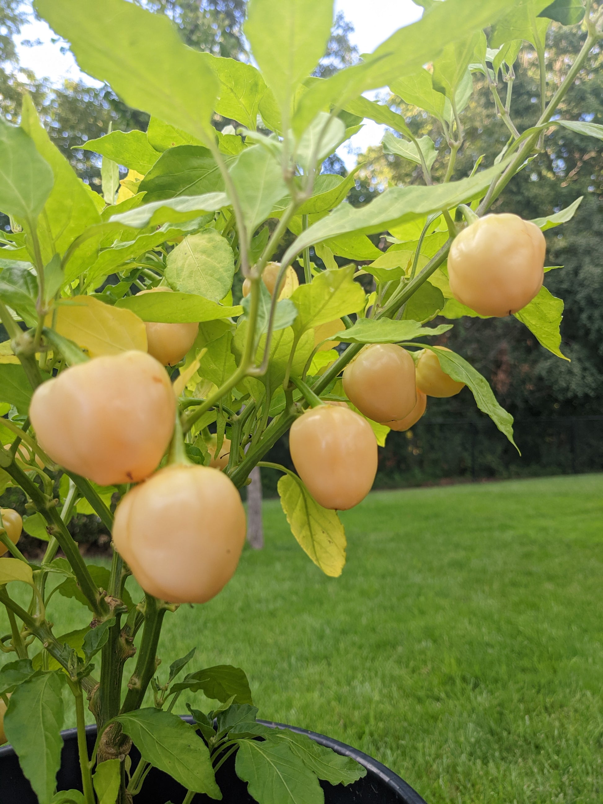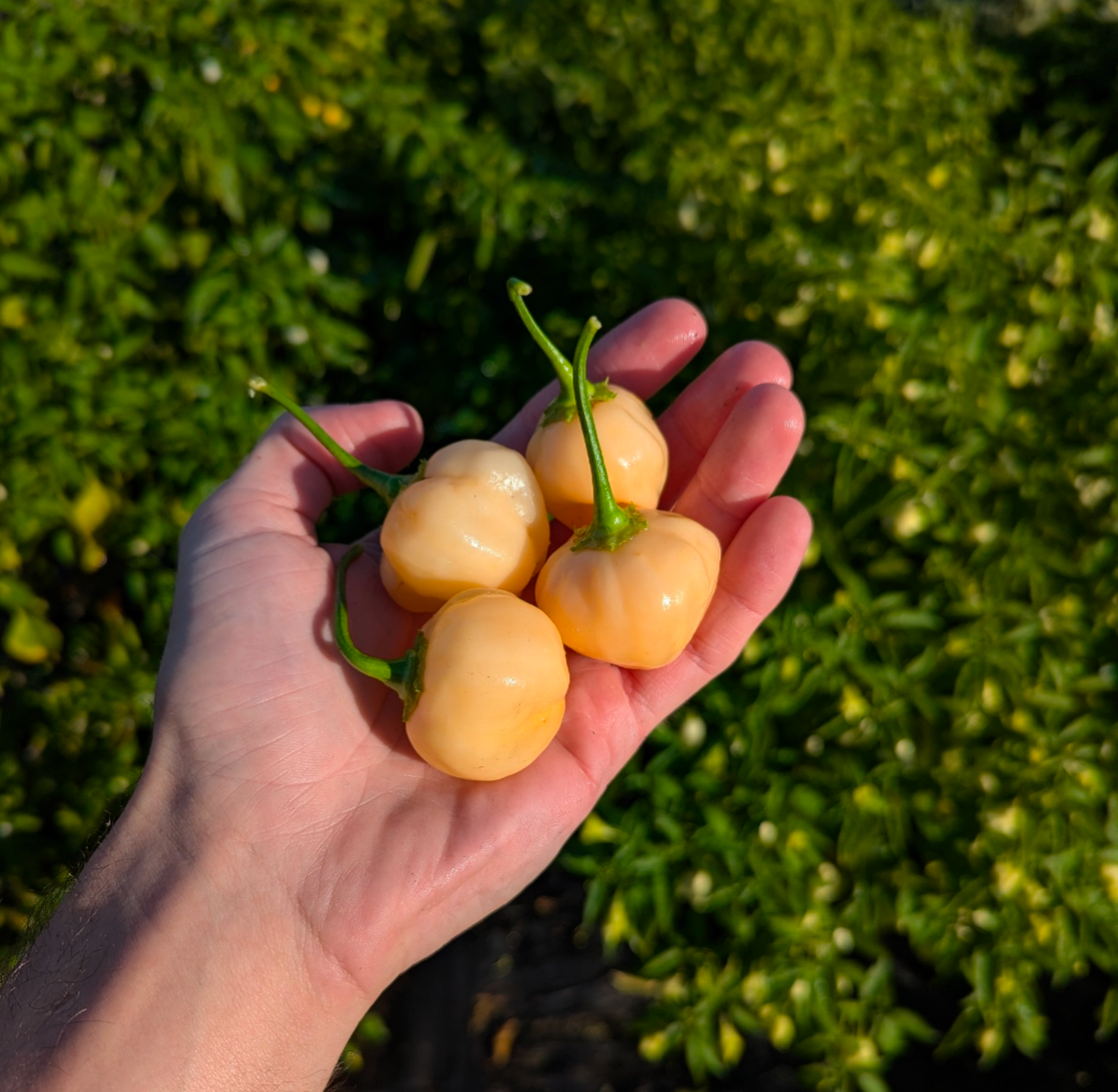 This is a very tasty pepper. Fruity flavour and very mild to no heat, less than a jalapeno. Pepper will start off a light green and ripen very slowly to its light peach colour. Peppers have thick walls giving every bite a big crunch. Lots of fun to pop in your mouth straight from the plant.